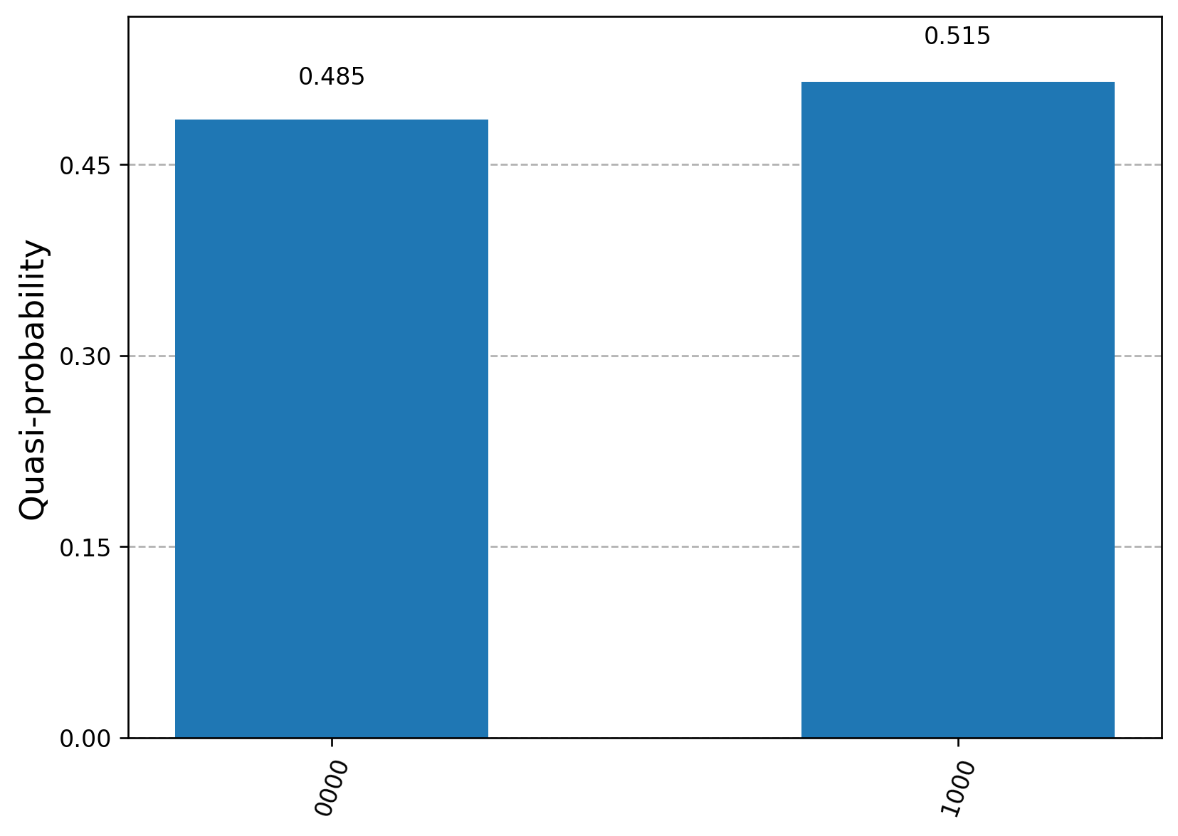 The probability for \(|0000\rangle\) and \(|1000\rangle\) states is approximately equal, encoding the two phase values \(\phi = 0\) and \(\phi = 1/2\):
